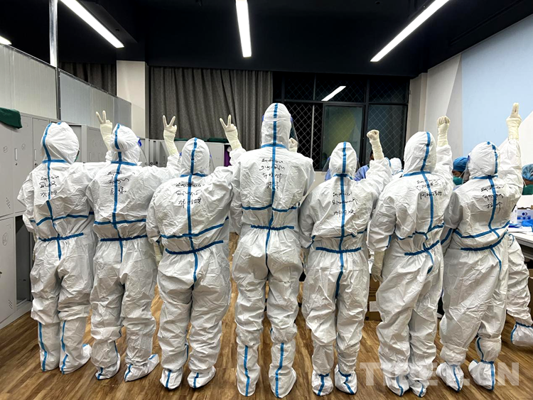 圖為拉薩市第二座方艙醫(yī)院醫(yī)護(hù)人員們正在穿防護(hù)服準(zhǔn)備開始一天的工作 攝影:次仁卓瑪