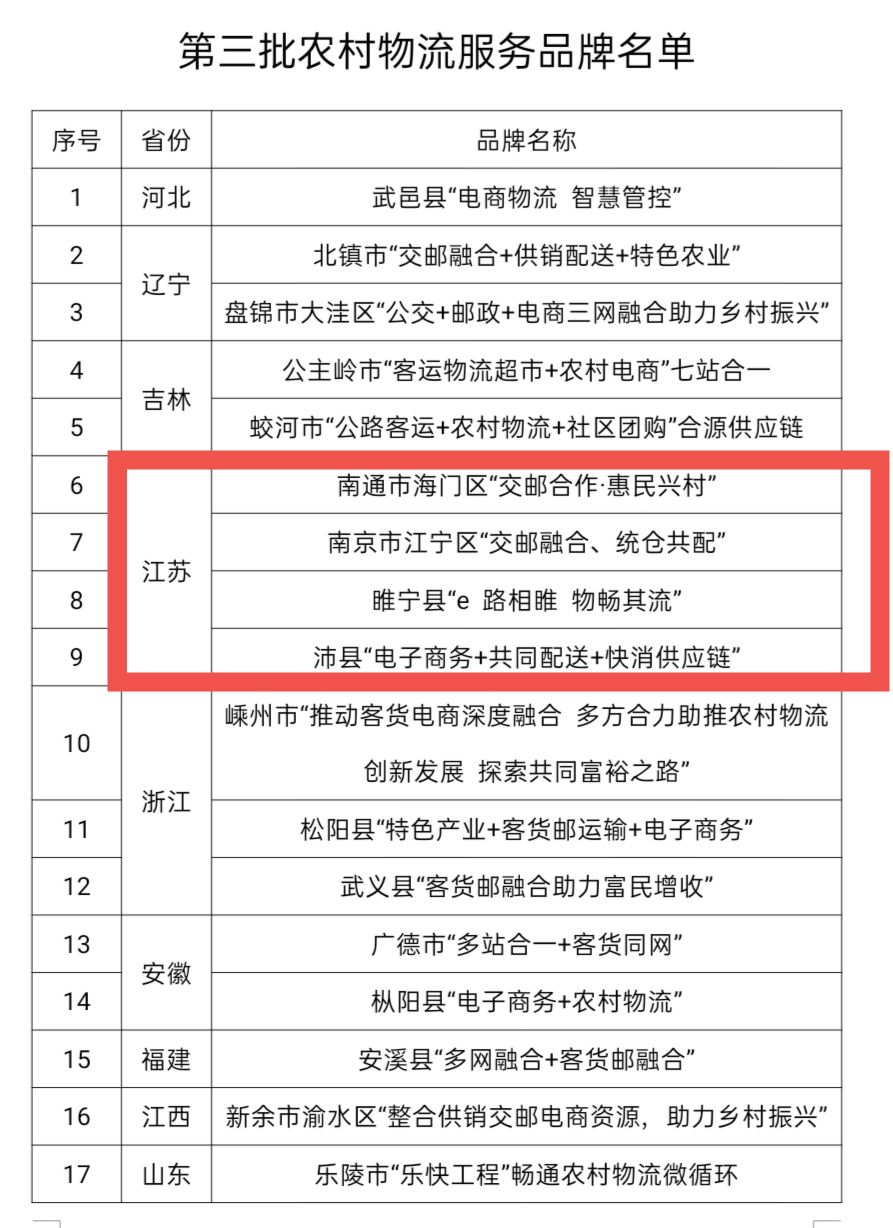 江蘇4項目入選全國第三批農(nóng)村物流服務品牌