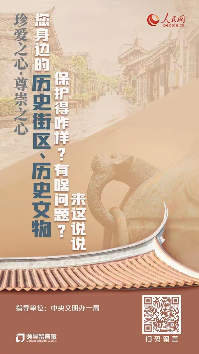 在你的家鄉(xiāng),或你現(xiàn)在生活、工作的地方,是否有具備保護(hù)價(jià)值的歷史街區(qū)與文物古跡?對(duì)于這些歷史街區(qū)與文物古跡的保護(hù)、展示與利用,你又是否有哪些建議或創(chuàng)新想法?歡迎來(lái)“領(lǐng)導(dǎo)留言板”說(shuō)說(shuō)()。