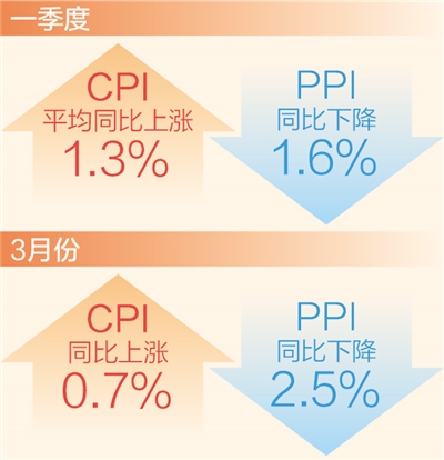 本報(bào)北京4月11日電 (記者劉志強(qiáng))國家統(tǒng)計(jì)局11日發(fā)布數(shù)據(jù)顯示:3月份,CPI(居民消費(fèi)價(jià)格指數(shù))同比上漲0.7%,漲幅比上月回落0.3個(gè)百分點(diǎn);PPI(工業(yè)生產(chǎn)者出廠價(jià)格指數(shù))同比下降2.5%,降幅比上月擴(kuò)大1.1個(gè)百分點(diǎn)。從一季度看,CPI平均同比上漲1.3%,PPI同比下降1.6%。一季度CPI持續(xù)運(yùn)行在合理區(qū)間,物價(jià)保持平穩(wěn)運(yùn)行,為全年物價(jià)穩(wěn)定奠定了堅(jiān)實(shí)基礎(chǔ)。