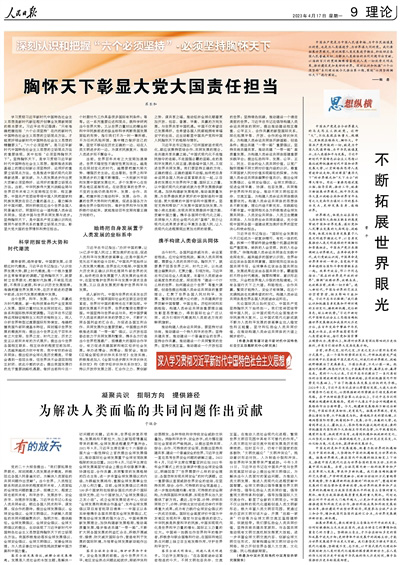 中國共產(chǎn)黨是為中國人民謀幸福、為中華民族謀復興的黨,也是為人類謀進步、為世界謀大同的黨。我們要拓展世界眼光,深刻洞察人類發(fā)展進步潮流,積極回應各國人民普遍關(guān)切,為解決人類面臨的共同問題作出貢獻,以海納百川的寬闊胸襟借鑒吸收人類一切優(yōu)秀文明成果,推動建設更加美好的世界。深刻認識和把握“六個必須堅持”系列理論版今天推出第六期,圍繞“必須堅持胸懷天下”進行闡述。