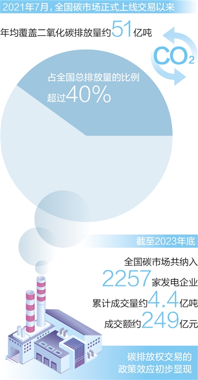 2021年7月全國碳市場正式上線交易以來,運行整體平穩(wěn),年均覆蓋二氧化碳排放量約51億噸,占全國總排放量的比例超過40%。截至2023年底,全國碳市場共納入2257家發(fā)電企業(yè),累計成交量約4.4億噸,成交額約249億元,碳排放權交易的政策效應初步顯現。