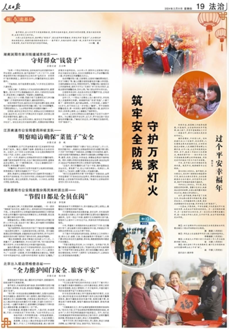 從深入社區(qū)宣傳反詐,保護(hù)群眾“錢(qián)袋子”,到扎進(jìn)市場(chǎng)明察暗訪,守好過(guò)年的“菜籃子”;從加強(qiáng)巡護(hù)保證游客安全,到便利通關(guān)服務(wù)旅客出行……春節(jié)前夕,本報(bào)記者深入基層一線,記錄平安守護(hù)者們的忙碌身影,見(jiàn)證平安守護(hù)者們的堅(jiān)守奉獻(xiàn)。
