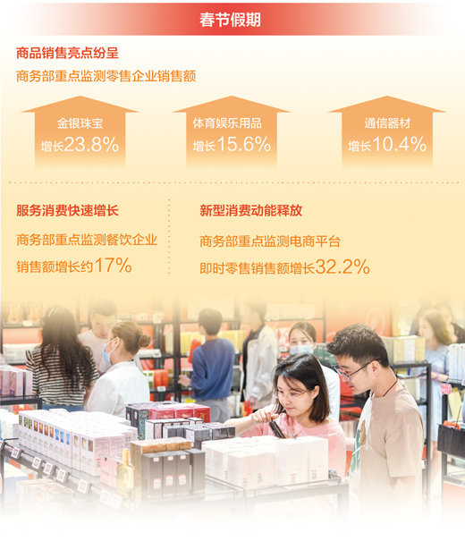 數(shù)據(jù)顯示,春節(jié)假期商品銷(xiāo)售亮點(diǎn)紛呈。春節(jié)假期,節(jié)慶商品、國(guó)貨潮品、綠色智能產(chǎn)品等持續(xù)旺銷(xiāo)。商務(wù)部重點(diǎn)監(jiān)測(cè)零售企業(yè)金銀珠寶、體育娛樂(lè)用品、通信器材銷(xiāo)售額同比分別增長(zhǎng)23.8%、15.6%和10.4%。