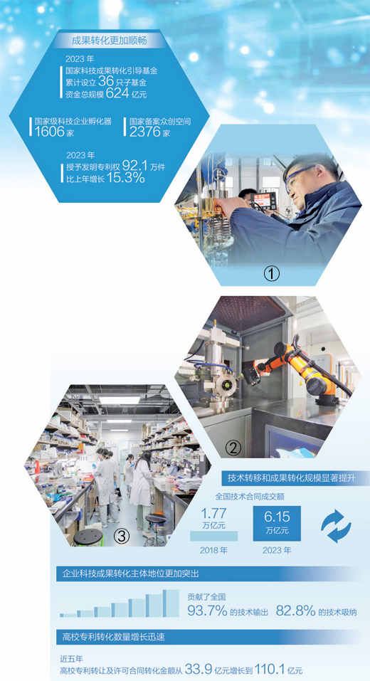 印發(fā)《“十四五”技術(shù)要素市場專項(xiàng)規(guī)劃》,從健全科技成果產(chǎn)權(quán)制度、強(qiáng)化高質(zhì)量科技成果供給等方面推動(dòng)成果轉(zhuǎn)化;印發(fā)《專利轉(zhuǎn)化運(yùn)用專項(xiàng)行動(dòng)方案(2023—2025年)》,對專利轉(zhuǎn)化運(yùn)用進(jìn)行專門部署;制定《高校和科研機(jī)構(gòu)存量專利盤活工作方案》,發(fā)揮市場和政府的協(xié)同作用,共同推動(dòng)專利成果更好更快地轉(zhuǎn)化為現(xiàn)實(shí)生產(chǎn)力……近年來,一系列部署,一項(xiàng)項(xiàng)探索,讓創(chuàng)新鏈的好技術(shù)變成產(chǎn)業(yè)鏈的新應(yīng)用,科技創(chuàng)新正在成為培育發(fā)展新質(zhì)生產(chǎn)力的新動(dòng)能。