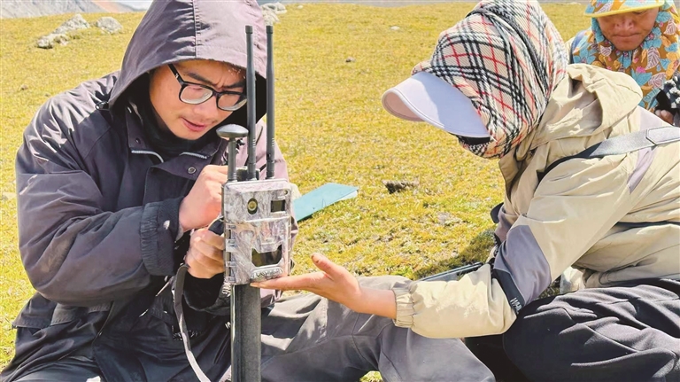 保護中心工作人員李義旺教當?shù)剞r(nóng)牧民架設紅外相機。