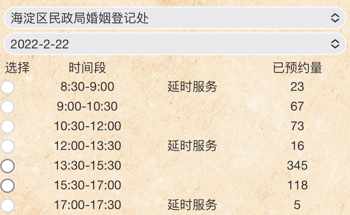 新人登記領證總想討個好彩頭,2月22日被網友稱為“充滿愛的日子”,受到追捧。記者通過北京市婚登系統(tǒng)查詢發(fā)現,各區(qū)在2月22日預約婚姻登記十分火爆,多個時段出現滿額情況。