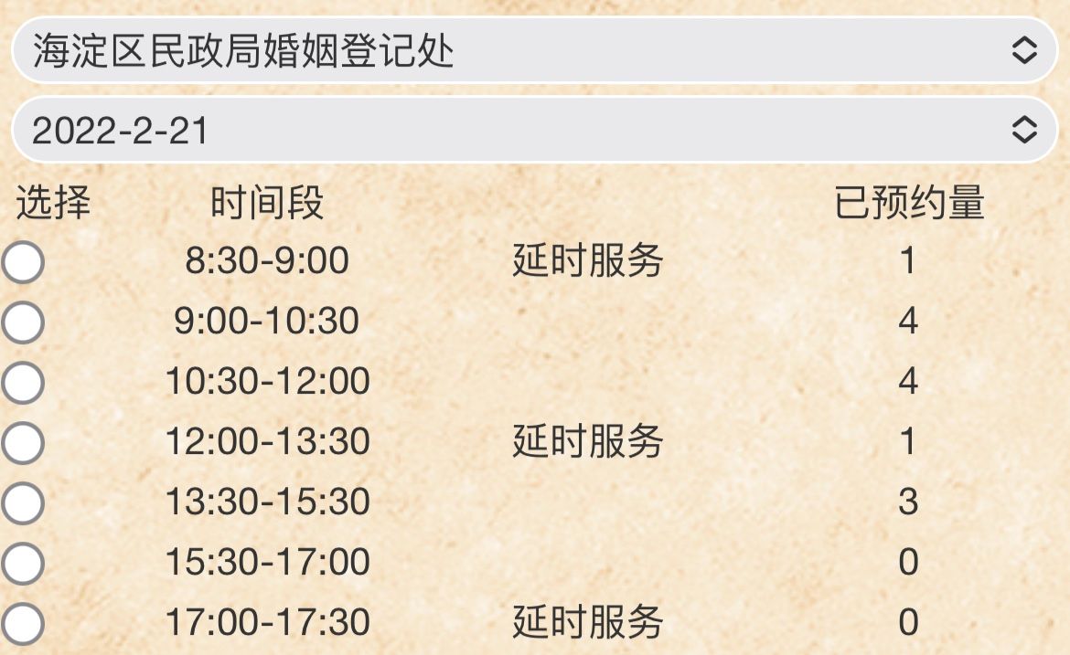 2020年9月起,北京推出政務“延時服務”,工作日除早晚提供半小時延時服務外,取消工作人員午休時間,周六延時工作一天。目前,全市婚登服務從8時30分持續(xù)至17時30分,全天分為7個預約時段。截至記者發(fā)稿時,東城、西城、朝陽、海淀、順義、大興等多區(qū)僅剩兩個時段還可預約。