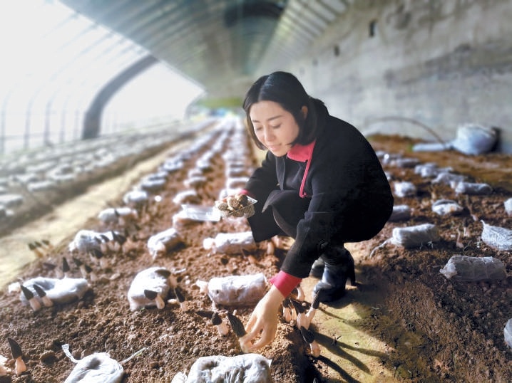 一頭利落的短發(fā),筆挺的身姿,明亮的笑容,39歲的董偉給人的第一印象有點颯。跟隨她來到位于懷柔區(qū)廟城鎮(zhèn)王史山村的溫室大棚,只見一個個小傘般的蘑菇頂蓋從土中鉆出來,看上去皺皺巴巴,筆直的菌柄呈象牙白色,村民們手持特制的小彎刀,嫻熟地將蘑菇從根部割下,不一會兒就裝滿了一筐?!斑@是羊肚菌,一種珍稀食用菌,聞起來有一股淡淡的香味。”說起蘑菇種植,董偉如數(shù)家珍,“羊肚菌是低溫菇,溫度一上來就不行了,收獲已經(jīng)接近尾聲。”