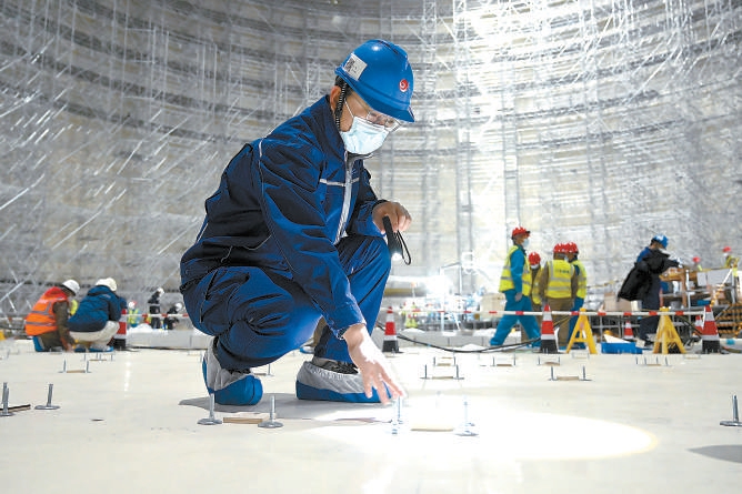項(xiàng)目部職工在薄膜罐內(nèi)檢查螺柱安裝情況。 北京燃?xì)饧瘓F(tuán)供圖