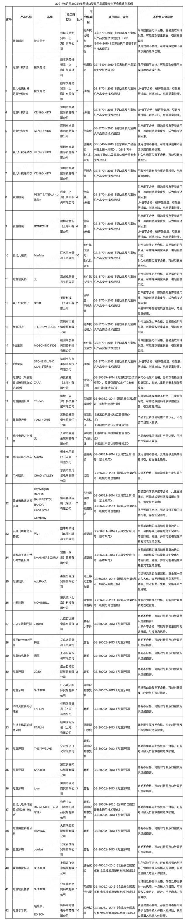 央廣網北京6月1日消息 據(jù)海關總署網站消息,6月1日,海關總署通報2021年6月至2022年5月間檢出的部分進口嬰童用品質量安全不合格典型案例,包括服裝、童鞋、玩具、牙刷、食品接觸產品等5類82批次進口嬰童用品,涉及拉夫勞倫、KENZO KIDS、ZARA和獅王等多個品牌產品。
