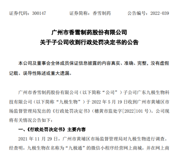 對此,香雪制藥表示,已要求九極生物主動調(diào)整生產(chǎn)計劃,更改下架相關(guān)廣告;對相關(guān)責(zé)任人員進(jìn)行處罰;組織工作人員對相關(guān)法律法規(guī)進(jìn)行學(xué)習(xí),完善內(nèi)部管理制度與操作規(guī)程,嚴(yán)格按照規(guī)定對產(chǎn)品宣傳進(jìn)行規(guī)范管理。截至本公告披露日前,相關(guān)整改已完成。