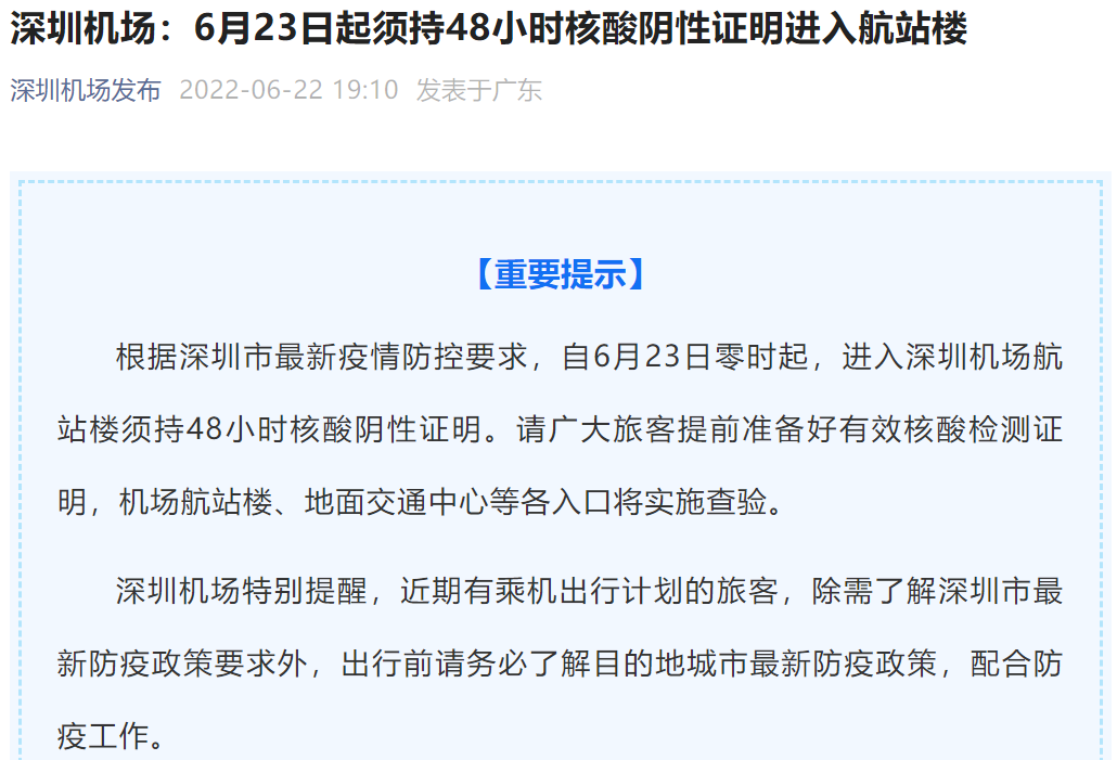 深圳機(jī)場:6月23日起須持48小時核酸陰性證明進(jìn)入航站樓