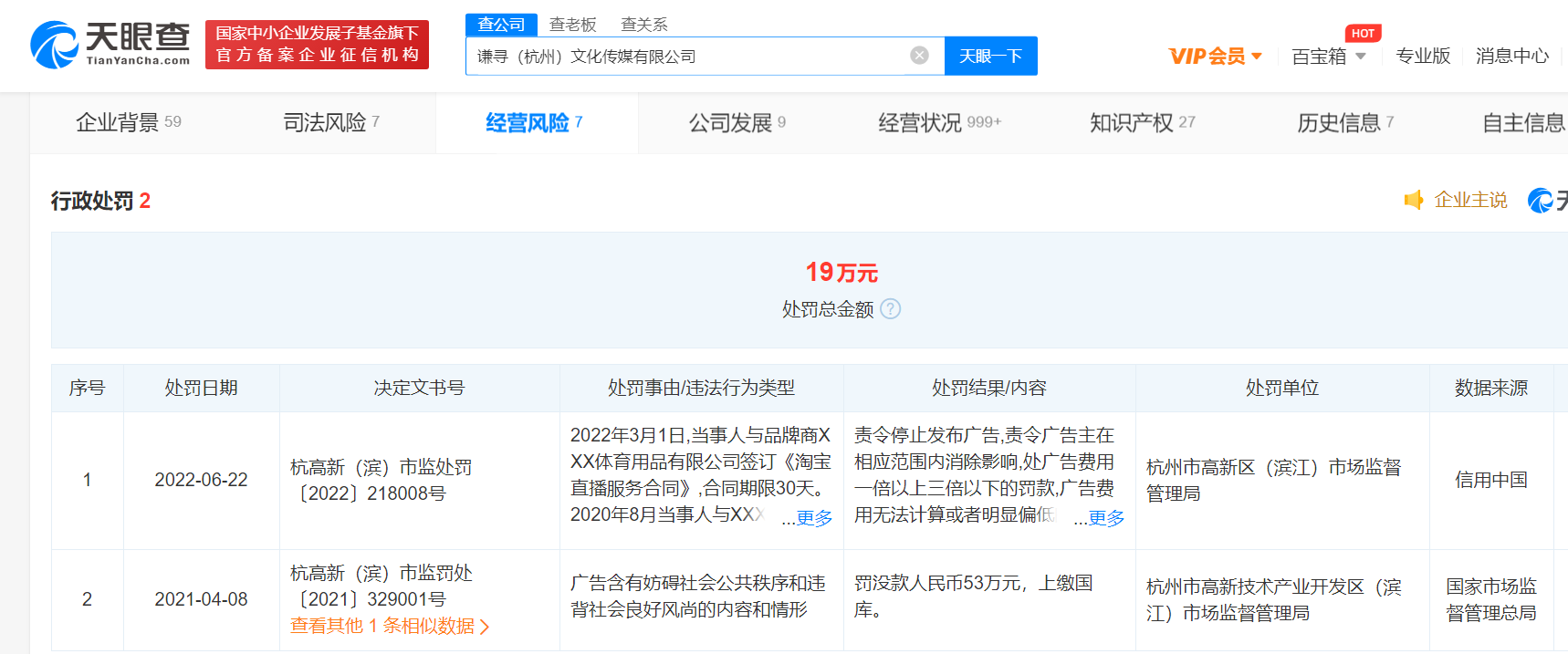 央廣網(wǎng)北京6月27日消息(記者 楊柳青) 近日,謙尋(杭州)文化傳媒有限公司因違反廣告法,被杭州市高新區(qū)(濱江)市場(chǎng)監(jiān)督管理局罰款19萬元。