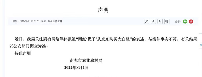 事件被越來(lái)越多人關(guān)注,公安部門已經(jīng)介入。平臺(tái)地址顯示“提子”位于四川南充,當(dāng)?shù)剞r(nóng)業(yè)農(nóng)村局的工作人員2日下午向記者證實(shí),已將涉事鯊魚送往鑒定機(jī)構(gòu)?!拔覀冎皥?zhí)法監(jiān)督科送檢了一部分,這個(gè)案件現(xiàn)在是刑事案件,公安機(jī)關(guān)在這邊處理。”