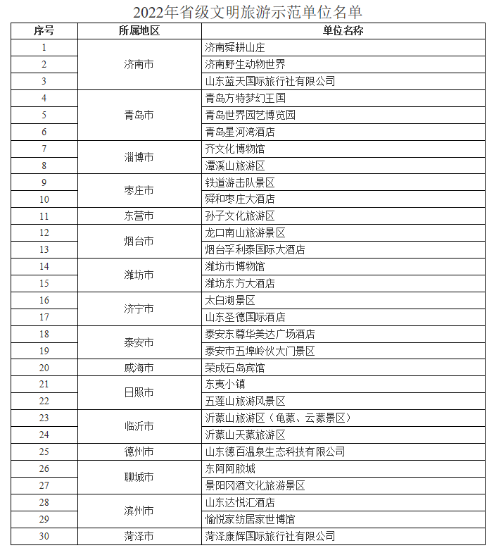 山東省認定30家單位為2022年省級文明旅游示范單位