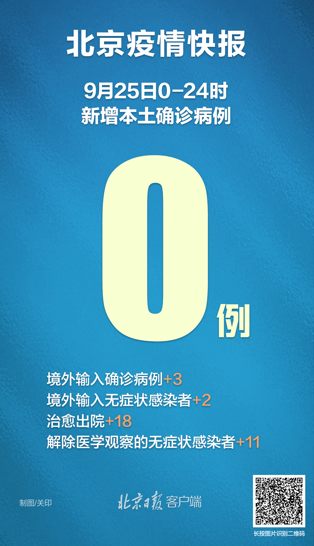 9月25日0時(shí)至24時(shí),北京無新增本土確診病例、疑似病例和無癥狀感染者;新增3例境外輸入確診病例和2例無癥狀感染者,無新增疑似病例。治愈出院18例,解除醫(yī)學(xué)觀察的無癥狀感染者11例。