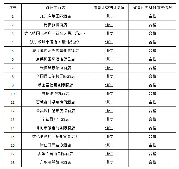 央廣網(wǎng)北京10月11日消息 據(jù)江西省文化和旅游廳消息,江西省星評委依據(jù)《旅游飯店星級的劃分與評定》(GB/T14308-2010)國家標(biāo)準(zhǔn)的相關(guān)要求,經(jīng)過相關(guān)酒店企業(yè)申請,相關(guān)評定委員會(huì)評定,現(xiàn)將待評四星級旅游飯店的十八家酒店進(jìn)行評定前公示。