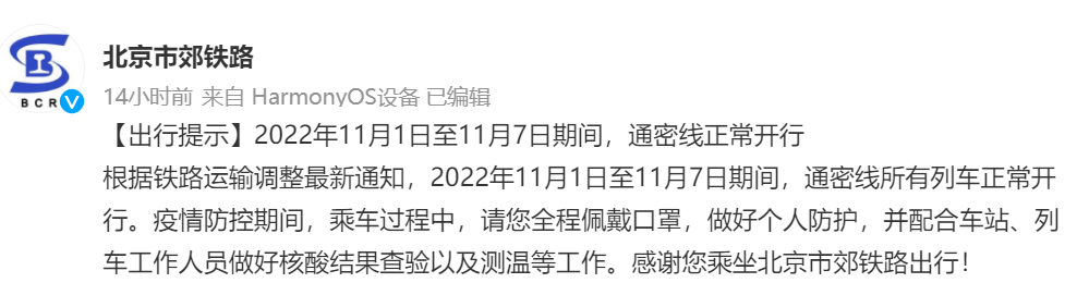 央廣網北京11月1日消息 據北京市郊鐵路官方微博消息,根據鐵路運輸調整最新通知,2022年11月1日至11月7日期間,通密線所有列車正常開行。