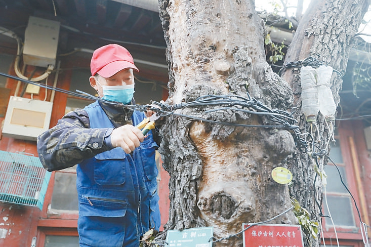 另一棵被困的古樹是上百歲的榆樹,位于育芳胡同某院落。這棵古樹上同樣掛著二級古樹的標(biāo)牌。工作人員采取措施對纏繞在樹身上的繩索、鐵絲進行清理。