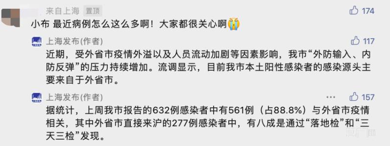 上周上海報告的632例陽性感染者中有561例(占88.8%)與外省市疫情相關(央廣網(wǎng)發(fā) 截自:上海發(fā)布微信公眾號)
