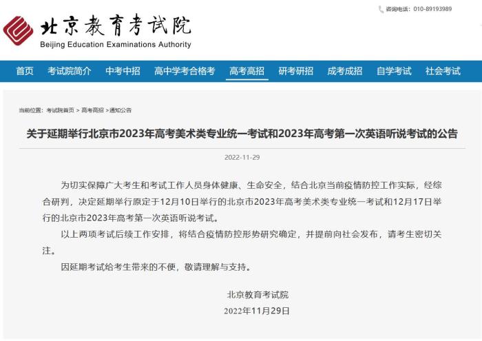 中新網(wǎng)11月29日電 據(jù)北京教育考試院網(wǎng)站消息,北京教育考試院29日發(fā)布公告,為切實保障廣大考生和考試工作人員身體健康、生命安全,結合北京當前疫情防控工作實際,經綜合研判,決定延期舉行原定于12月10日舉行的北京市2023年高考美術類專業(yè)統(tǒng)一考試和12月17日舉行的北京市2023年高考第一次英語聽說考試。