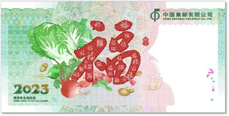紀(jì)念券背面主景采用多個(gè)“福”字的組合,寓意著新的一年福氣連連、福滿門(mén)。背景團(tuán)花中有玉兔搗藥的圖案,表達(dá)了疫情之下祈求健康、幸福的真摯愿望。白菜、蘿卜、蘑菇也都有著各自的深意,比如白菜諧音“百財(cái)”,且有清白之意;蘿卜在閩南方言叫“菜頭”,諧音彩頭;蘑菇則象征蓬勃向上的生命力量。這些看似普通的元素給人以親切之感,更寓意著源源不斷的財(cái)運(yùn)、好運(yùn)和幸運(yùn)。