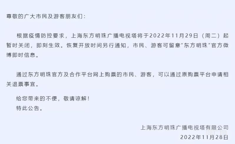 上海東方明珠廣播電視塔有限公司28日晚發(fā)布公告稱,根據(jù)疫情防控要求,上海東方明珠廣播電視塔于2022年11月29日起暫時關(guān)閉,即刻生效?;謴烷_放時間另行通知,市民、游客可留意“東方明珠”官方微博即時信息。