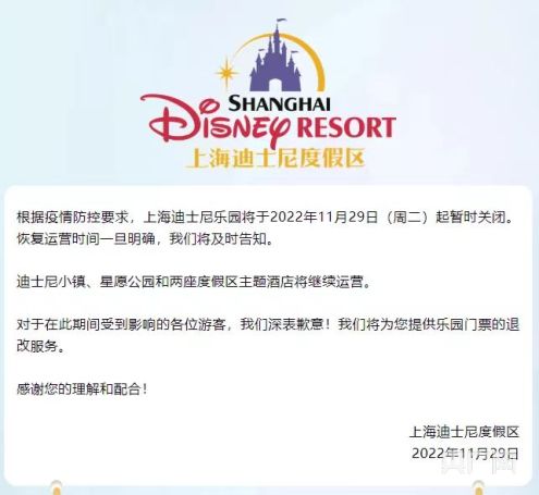 上海迪士尼樂園11月29日起暫時關(guān)閉