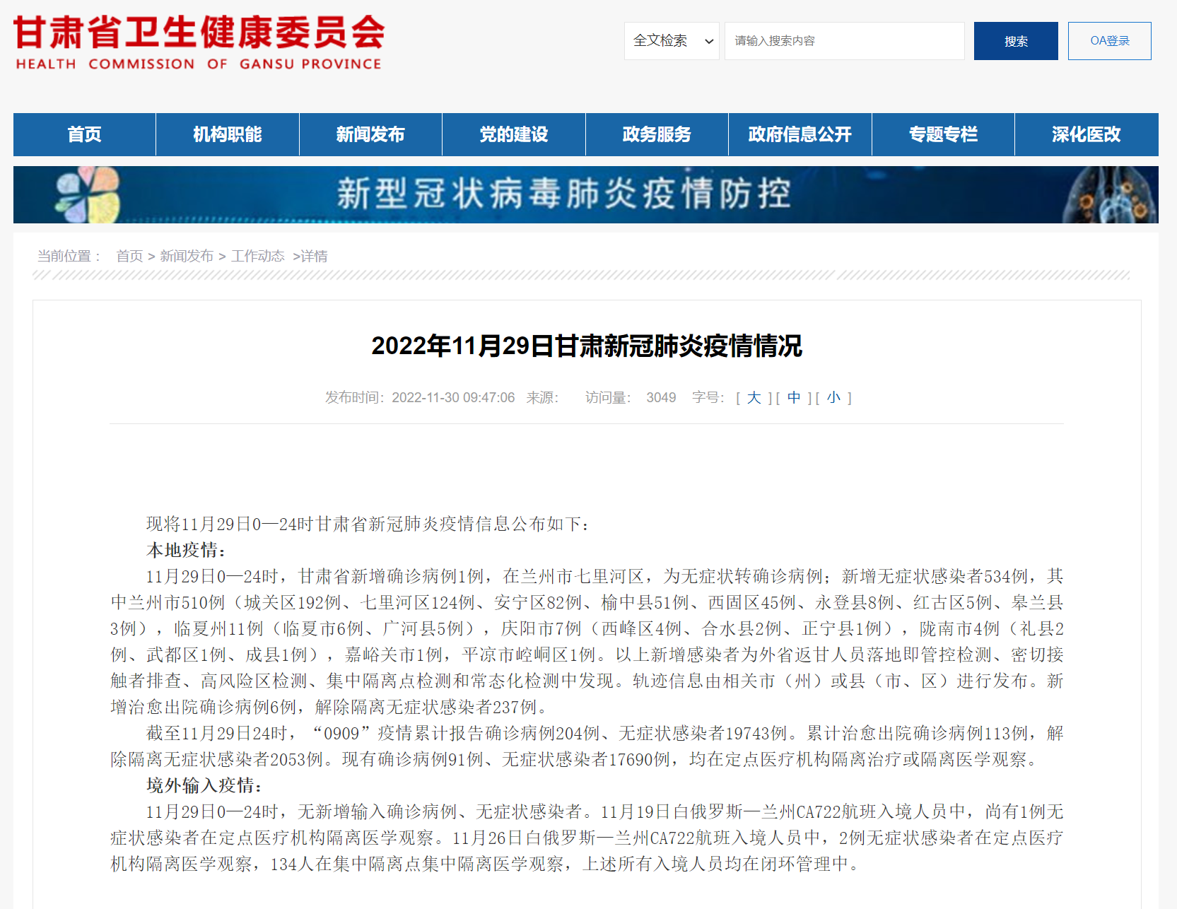 11月29日甘肅新增確診病例1例,無癥狀感染者534例
