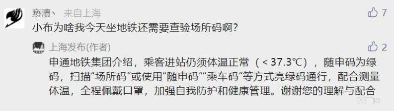 “上海發(fā)布”微信公眾號(hào)回復(fù)稱,乘客進(jìn)站仍須體溫正常(<37.3℃),隨申碼為綠碼,掃描“場(chǎng)所碼”或使用“隨申碼”“乘車碼”等方式亮綠碼通行,配合測(cè)量體溫,全程佩戴口罩,加強(qiáng)自我防護(hù)和健康管理。