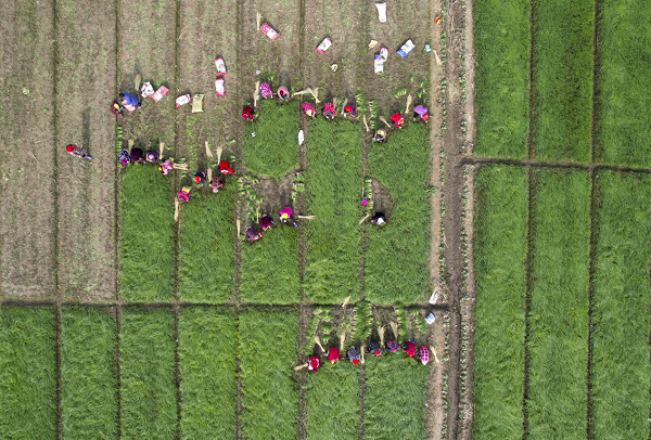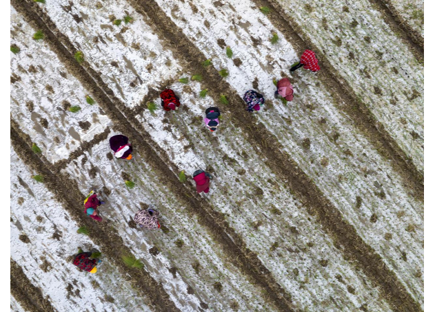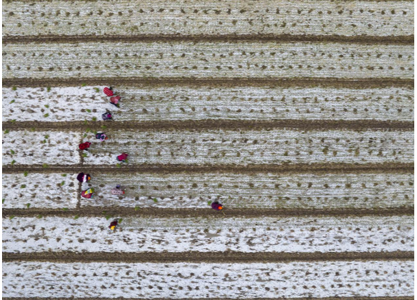 蔥農(nóng)在田間的塑料薄膜里移栽洋蔥苗,俯瞰就像地里落滿(mǎn)白雪(央廣網(wǎng)發(fā) 張清 攝)