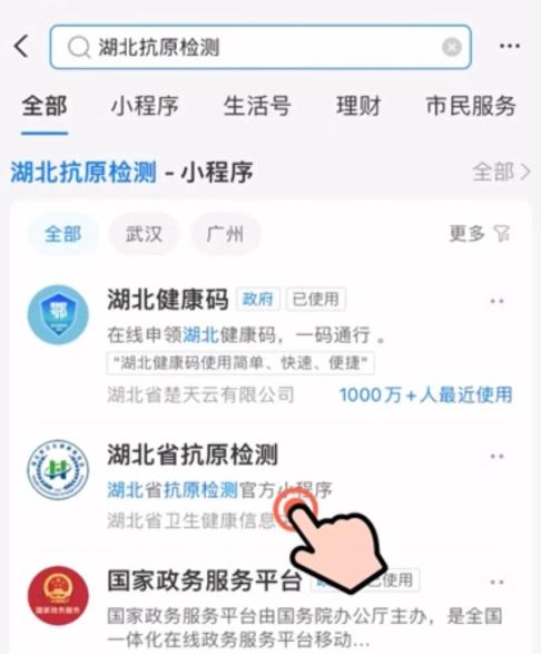 1.首先打開支付寶,搜索“湖北抗原檢測”,點(diǎn)擊“湖北省抗原檢測官方小程序”,進(jìn)入“個人檢測上報(bào)”。