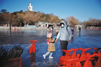 北海公園自古就有“冬宮”之美稱,據(jù)史料記載,北海歷史上有“冰嬉之制”,慈禧太后曾在冬季到北海觀看冰嬉表演,光緒帝曾在北海太液池上乘坐冰橇。記者29日在南門荷花湖看到,湖面冰層凍得厚實(shí),冰場(chǎng)剛一開(kāi)門,不少游客已經(jīng)迫不及待入場(chǎng),在冰面上玩起了冰車。