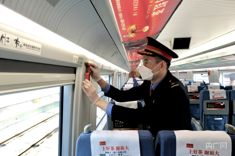 彭昊正在檢查列車內(nèi)安全設備(央廣網(wǎng)發(fā) 受訪者供圖)