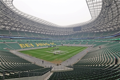 走進(jìn)新工體項(xiàng)目區(qū)域,清灰色外立面的工人體育場在陽光下熠熠生輝,綠茵賽場整裝待發(fā),看臺(tái)上環(huán)繞著寫有“北京國安”的綠色燈條。
