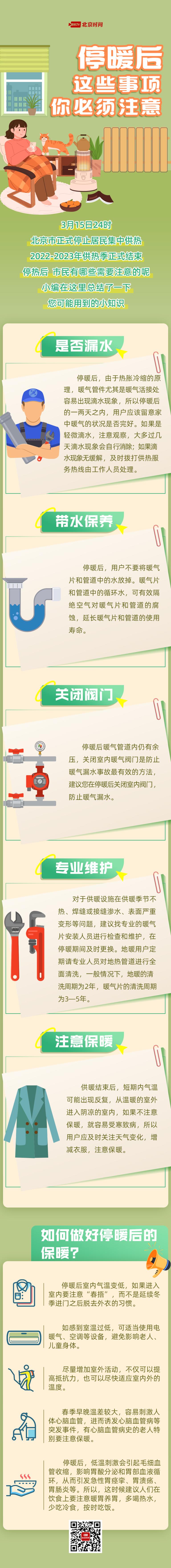 今日(16日)起,北京市正式停止居民集中供熱,都有哪些注意事項?首先要做好供熱設備的維護,包括及時檢測暖氣管道是否漏水,不要放掉暖氣管道中的水,停暖后及時關(guān)閉室內(nèi)閥門并安排專業(yè)人員對供暖設施進行維護和清洗。在停暖后還需注意保暖,如注意“春捂”,增加室外活動,注重心血管和腸胃的保暖,避免早晚溫差刺激。停暖知識帖來了,戳圖了解→