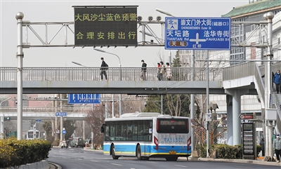 3月22日,天壇路,電子顯示屏提示,大風沙塵藍色預警,合理安排出行。新京報記者 王飛 攝