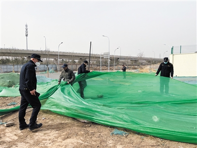 3月22日,石景山古城街道綜合行政執(zhí)法人員來到轄區(qū)內工地,要求施工單位對裸露地面、渣土堆放場所及時苫蓋,施工期間進行灑水降塵,渣土運輸車輛確保清潔到位上路不遺撒,從源頭杜絕揚塵污染源的發(fā)生。新京報記者 浦峰 通訊員 王亞楠 攝