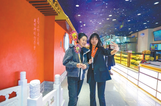 在位于朝外附近的北京稻香村零號(hào)店新店內(nèi),顧客在充滿(mǎn)古都元素的紅墻金瓦前打卡留影。 本報(bào)記者 武亦彬攝