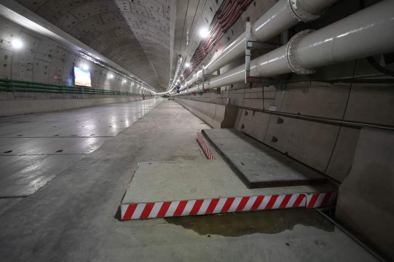 此外,箱涵兩側(cè)分別設(shè)置有管廊與人員應(yīng)急通道,而這些在路面鋪設(shè)完畢后都將藏于路面下方,對通行者來說完全是無感的。孫長松指著路面上的一處蓋有擋板的地方告訴記者,這里就是人員應(yīng)急通道的入口,通車后路面上將設(shè)置用液壓控制的智能蓋板,正常狀態(tài)下,它與路面嚴(yán)絲合縫地貼在一起,在發(fā)生意外情況、需要疏散人員時,它則會及時開啟。