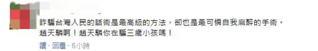 也有臺灣網(wǎng)友評論表示“果然是綠色邏輯思維,沒有最勇敢,只有最無知!”“趙天麟是在說相聲嗎?真愛鬼扯!”“詐騙臺灣人民的話術(shù)是最高級的方法,卻也是最可憐自我麻醉的手術(shù)!趙天麟?。≮w天麟你在騙三歲小孩嗎?”