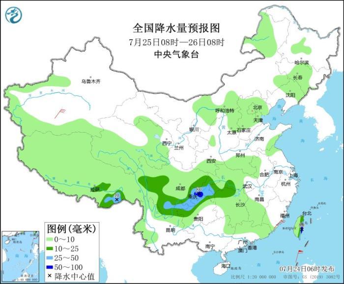 7月25日08時至26日08時,四川西部和南部、重慶大部、湖北西南部、湖南西北部、貴州北部、云南東北部、西藏東南部、臺灣島東部等地的部分地區(qū)有中到大雨,局地有暴雨(50~80毫米)(見圖3)。新疆南疆盆地、浙江東部等地的部分地區(qū)有4~6級風。