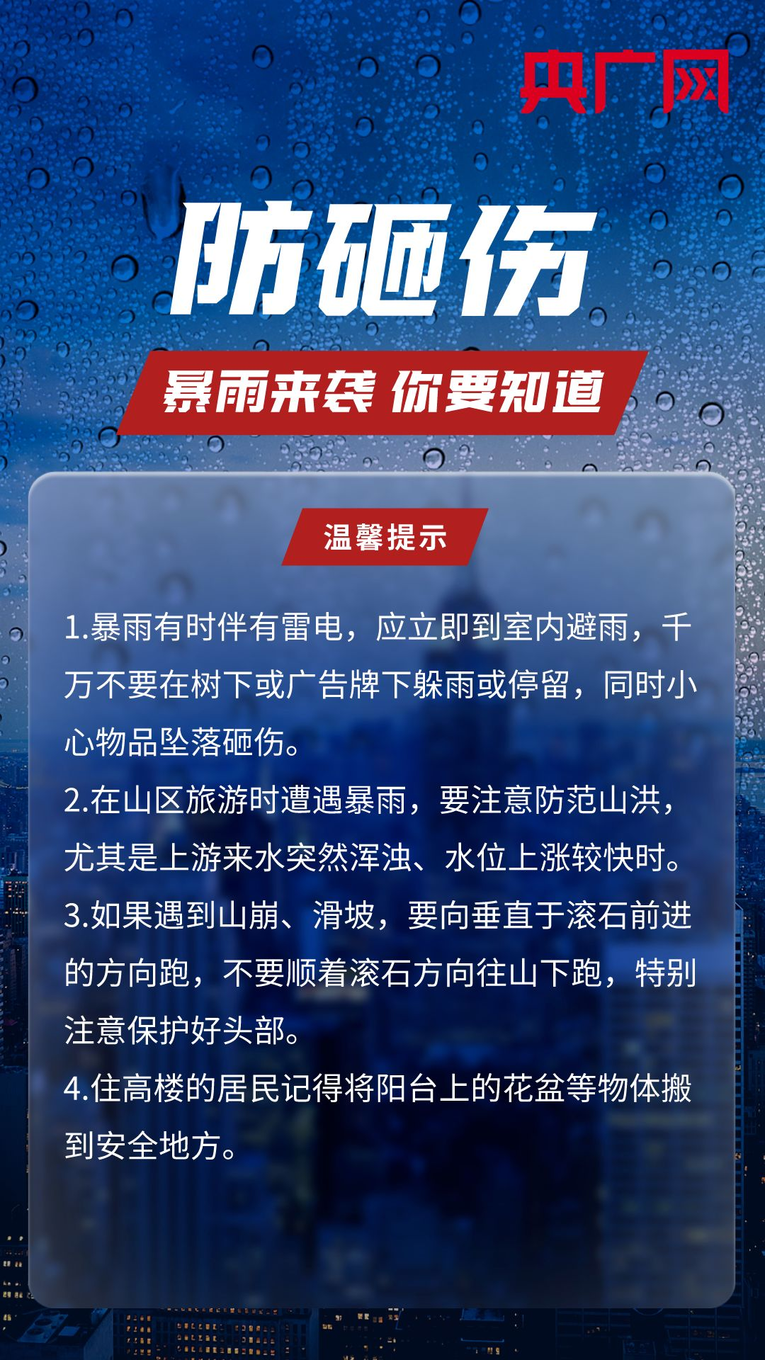 央廣網(wǎng)北京8月1日消息 近日,多地連降暴雨,雨情牽動著人們的心。暴雨來臨前,我們能提前做哪些準備工作?暴雨天不得不外出時,又該如何做好防范?戳圖了解↓↓