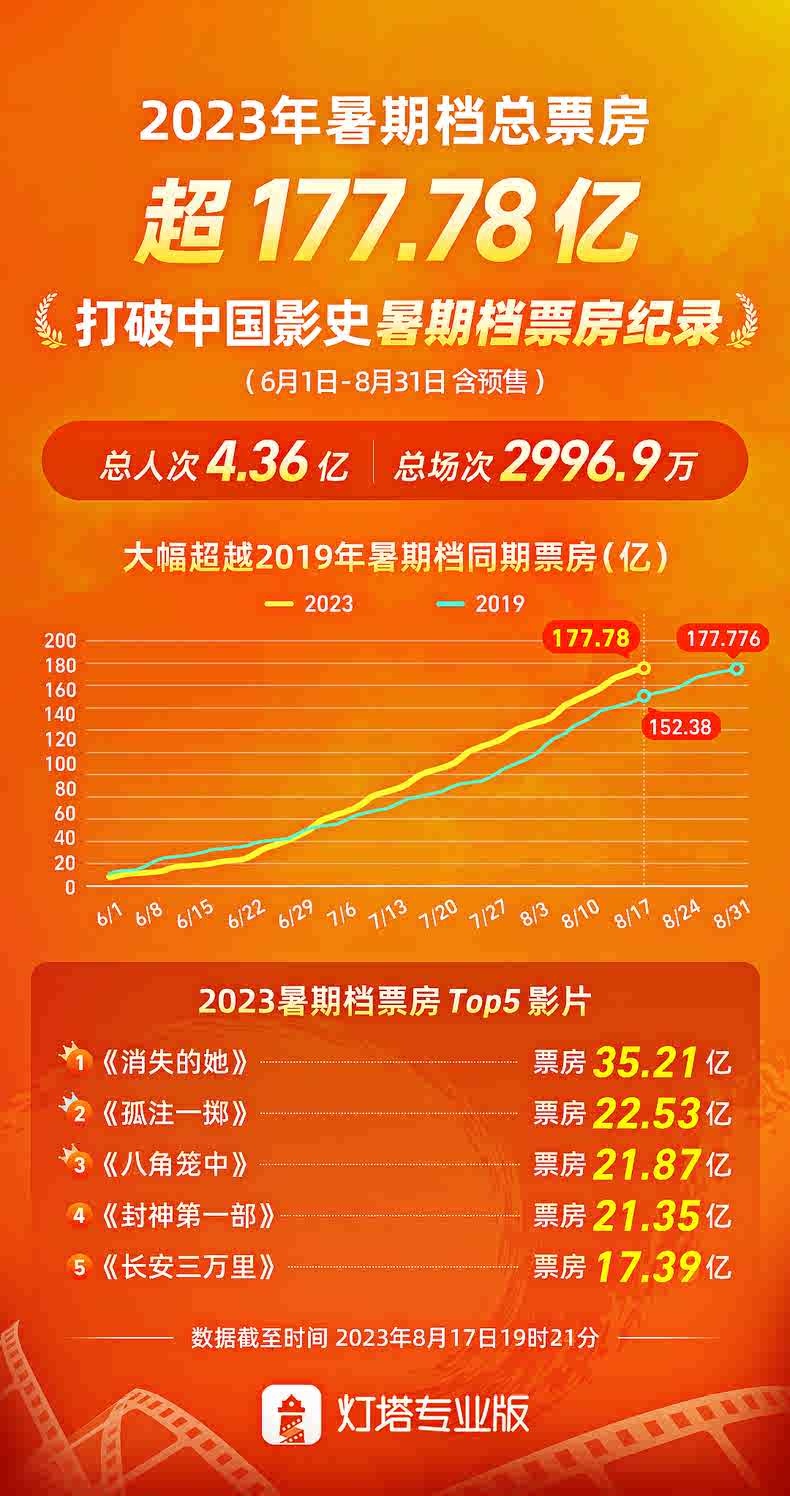 暫列2023年暑期檔票房榜前五名影片分別為:《消失的她》《孤注一擲》《八角籠中》《封神第一部》《長(zhǎng)安三萬(wàn)里》。