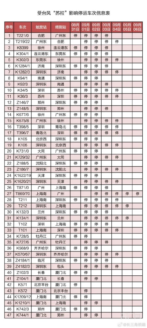 記者從中國(guó)鐵路上海局集團(tuán)有限公司獲悉,受第9號(hào)臺(tái)風(fēng)“蘇拉”影響,為確保列車(chē)運(yùn)行安全,鐵路部門(mén)計(jì)劃對(duì)杭深線、京港高鐵、廣深城際、廣深港高鐵、穗深城際、京九線等線路運(yùn)行的部分列車(chē)采取停運(yùn)措施。截至30日17時(shí)30分,計(jì)劃停運(yùn)8月31日至9月6日間共121趟旅客列車(chē):其中停運(yùn)動(dòng)車(chē)組列車(chē)74趟,停運(yùn)普速列車(chē)47趟。