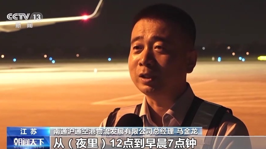 南通滬通空港物流發(fā)展有限公司總經(jīng)理 馬金龍:從夜里12點到早晨7點鐘,陸續(xù)有8個航班離港,目的站主要是廣州、深圳、北京幾個機場。