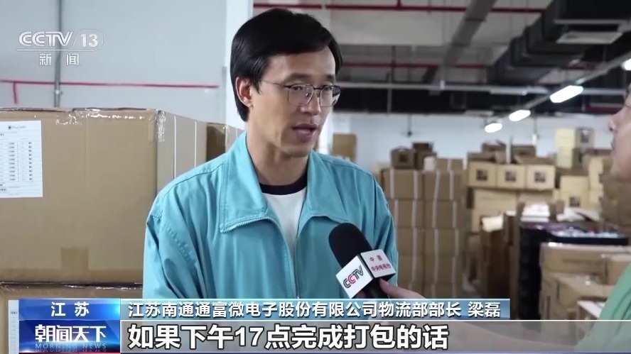 江蘇南通通富微電子股份有限公司物流部部長 梁磊:我們當天的出貨,如果17點完成打包的話,當天晚上12點前,基本就能到達深圳??蛻舻囊恍┨丶奔?,我們甚至凌晨就能派送到位。