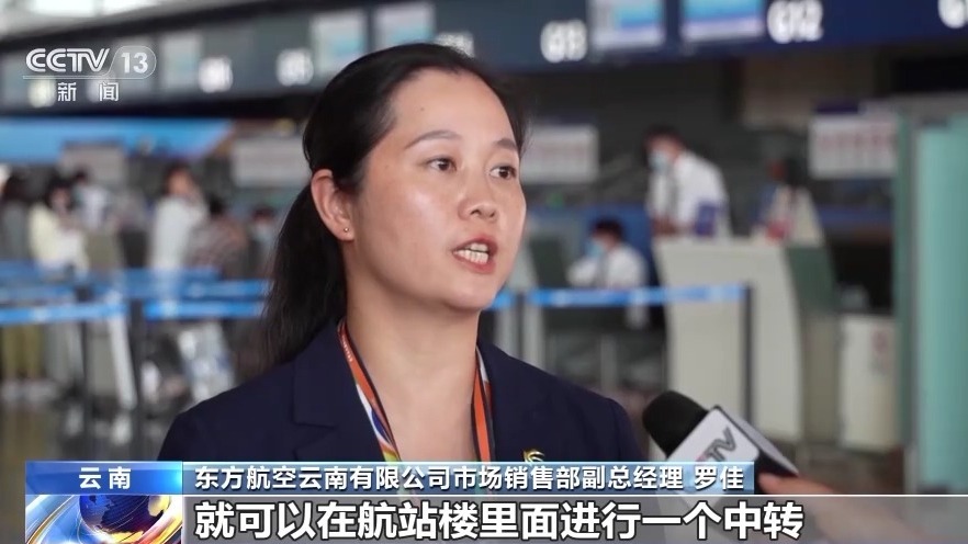 東方航空云南有限公司市場銷售部副總經(jīng)理 羅佳:旅客不需要出隔離區(qū),就可以在航站樓里面進行中轉(zhuǎn),并且行李直掛,行李從始發(fā)站開始不用二次提取。
