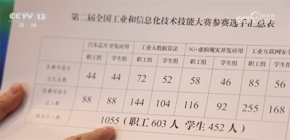 總臺央視記者 張叢婧:這是決賽的參賽表,可以看到,這次的選手有1000多名。我發(fā)現(xiàn),選手里將近一半都是學生,他們大部分來自職業(yè)院校。主辦方告訴我,和去年相比,今年學生的比例提高了30%多。